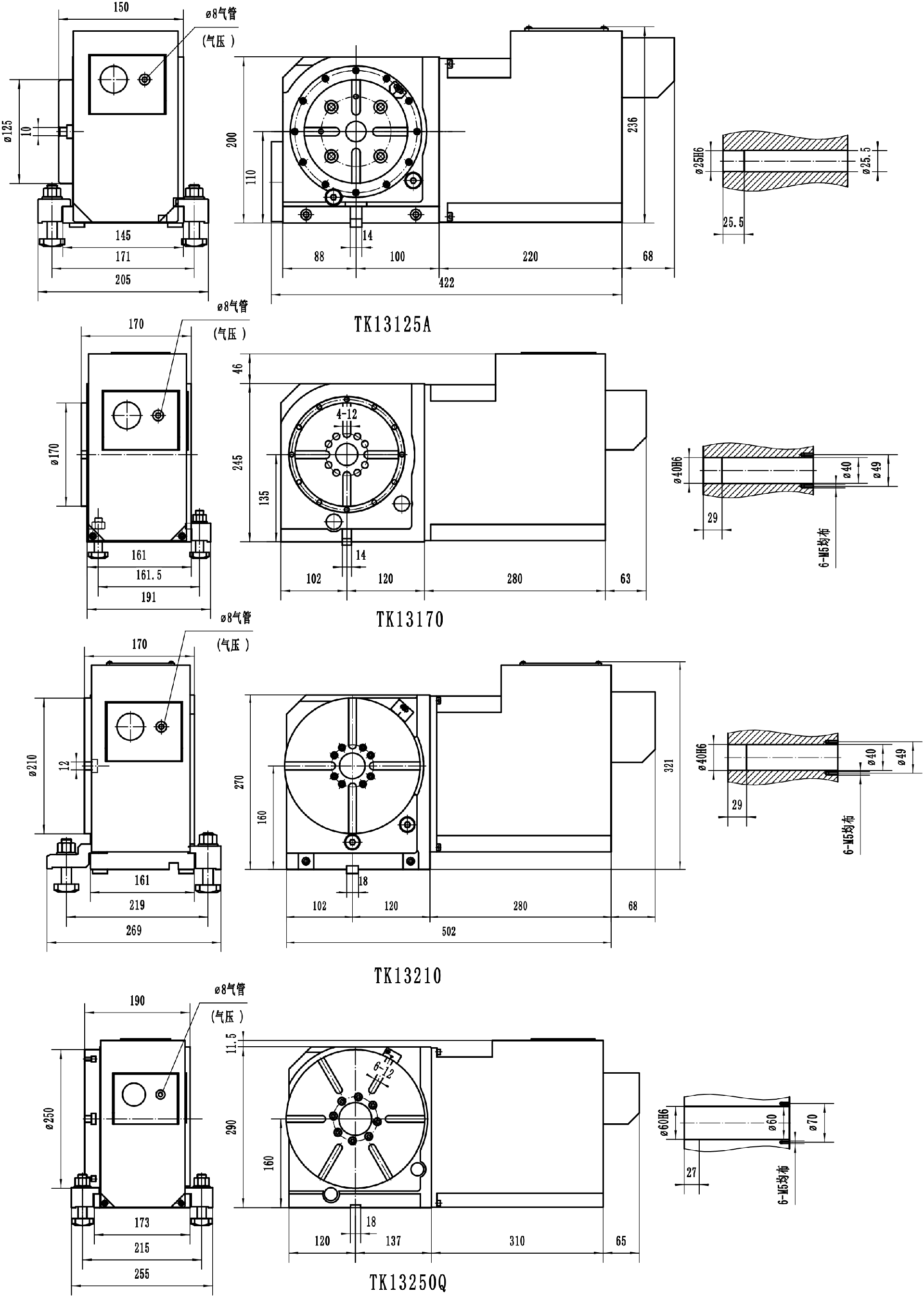 TK13系列數(shù)控立臥回轉(zhuǎn)工作臺(tái)是各類數(shù)控銑床和加工中心的關(guān)鍵配套附件,可以主軸垂直和水平兩種方式安裝在主機(jī)工作臺(tái)上,用作主機(jī)的第四回轉(zhuǎn)軸。轉(zhuǎn)臺(tái)在主機(jī)相關(guān)控制系統(tǒng)控制下,可實(shí)現(xiàn)等分的和不等分的孔、槽或者連續(xù)特殊曲面的加工,且保證很高的加工精度。